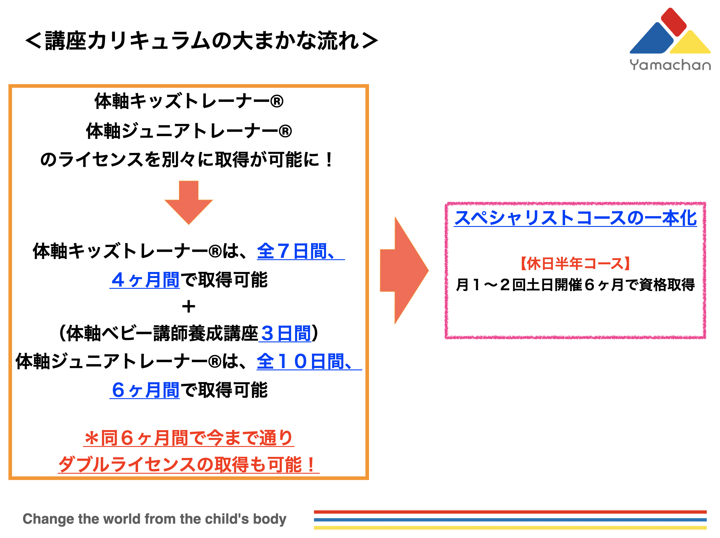 資格取得後は体軸キッズトレーナー/体軸ジュニアトレーナーとして、新たに5つのWSコンテンツ(乳幼児期~ジュニア期、大人期の全世代を網羅!)をお渡ししますので、そのWS開催を通して地域で活躍していけます。